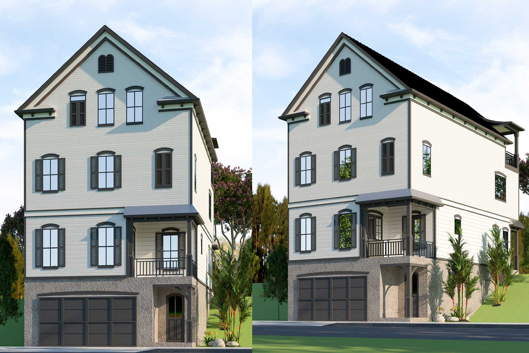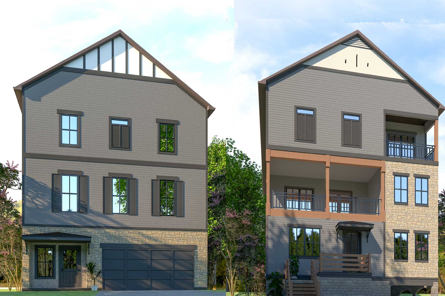 equipped with elevators, and outdoor roof level porches and terrace level patios, the